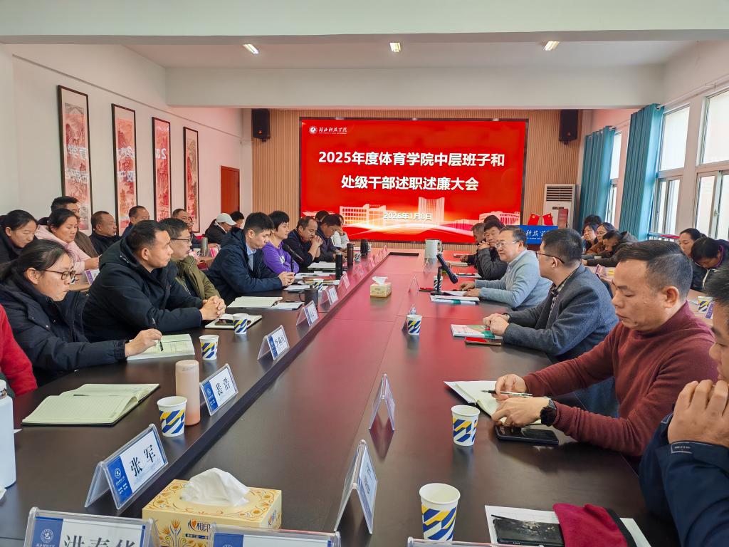 2026年1月8日下午,体育学院2025年度领导班子和处级干部述职述廉大会在学院二楼会议室召开。学校党委常委、副校长白育庭出席会议并讲话。教务处副处长赵骥,体育学院全体教职工参加会议,会议由体育学院党委书记张欢主持。