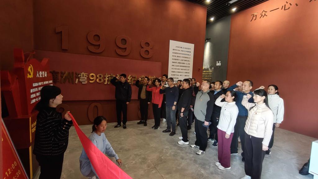 参观结束后,在纪念馆大厅,全体党员同志面对鲜红的党旗,重温入党誓词。学院党委书记张欢同志领誓,并作活动总结。他结合个人参观学习的体会,要求全体党员教师要从伟大的抗洪精神中汲取磅礴力量,将其转化为推进学院国家一流专业建设、申硕等工作的强大动力,坚持为实现“教育强国”“体育强国”的国家战略贡献力量,在新时代新征程上展现体育人的担当作为。